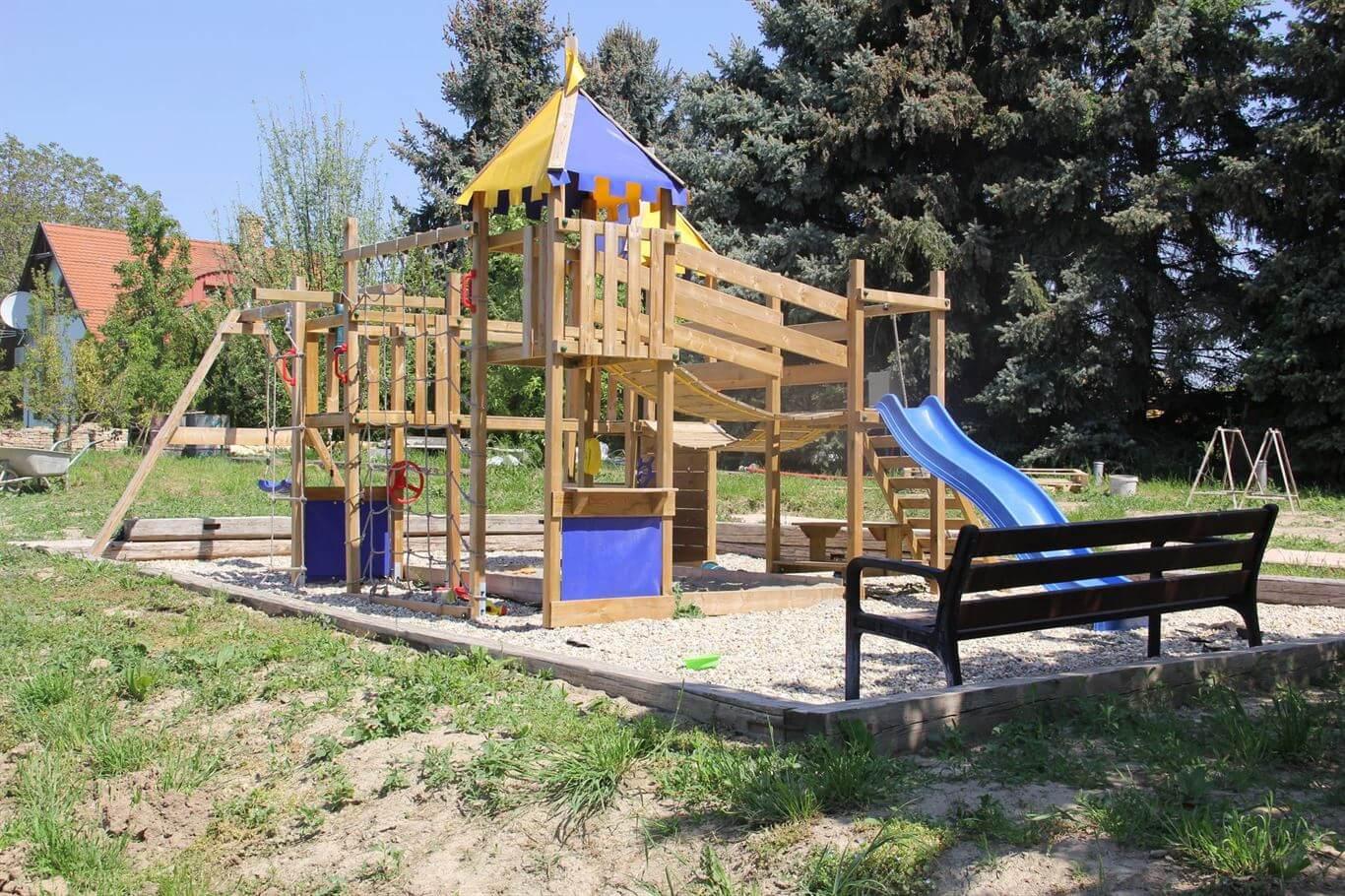 A kertben kültéri medence, jakuzzi, dézsafürdő, grillezési és bográcsozási lehetőség, játszótér és zöld területek biztosítják, hogy minden korosztály jól érezze magát. A kertben közös esték és szabadtéri programok is megvalósíthatók.