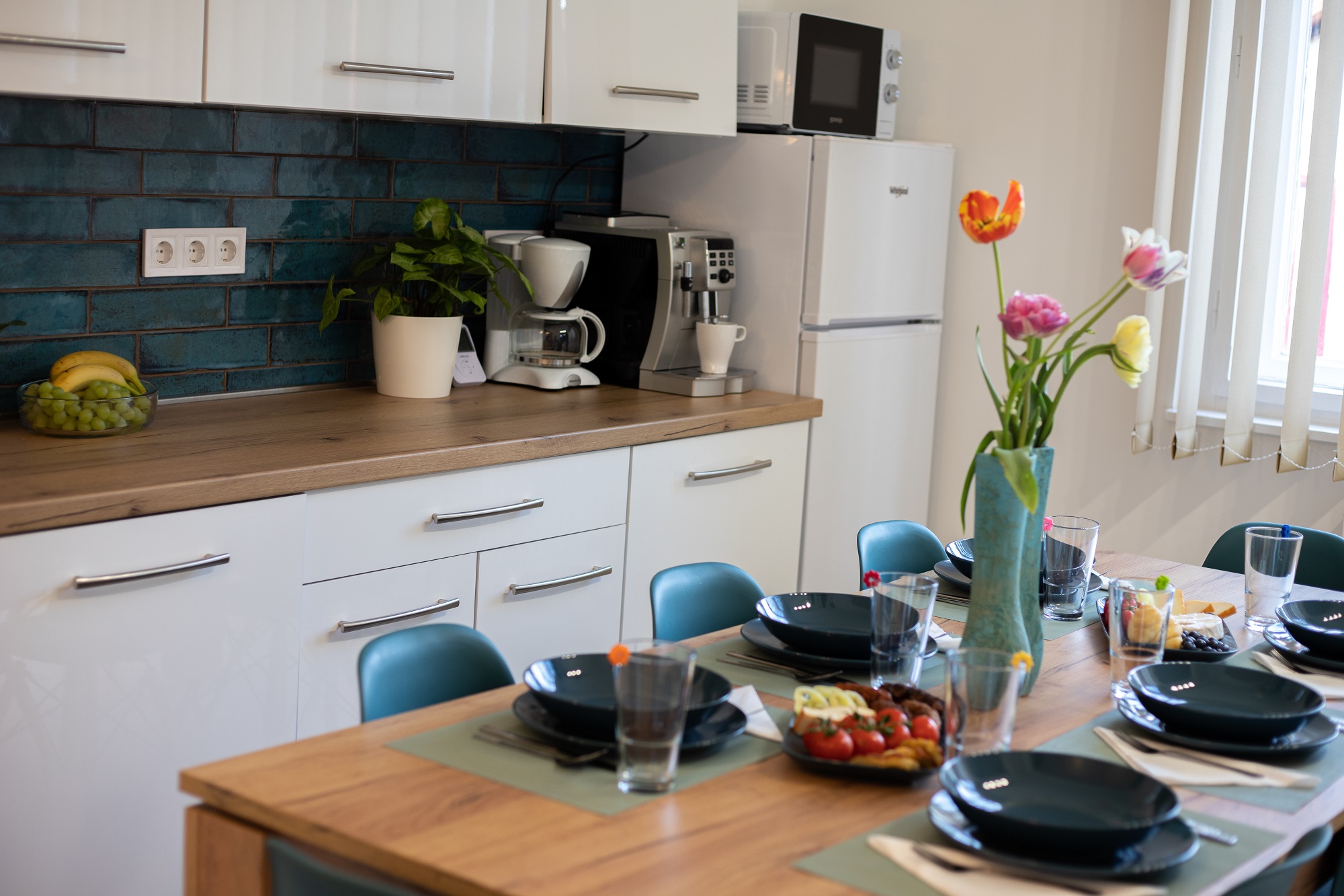 A kertben évszaktól függően cseresznye, málna, füge és alma is érik – vendégeink gyakran említik, milyen különleges élmény volt saját kezűleg leszedni a friss gyümölcsöket. A kerti játékok, járgányok és labdák mind a szabad mozgást és a közös időt szolgálják, a nagyobbaknak pedig a közeli Városligeti játszótér kínál újabb kalandot. A baráti társaságok különösen kedvelik a tágas, fedett teraszt, ahol kényelmesen lehet együtt főzni, vacsorázni vagy csak beszélgetni egy pohár bor mellett.